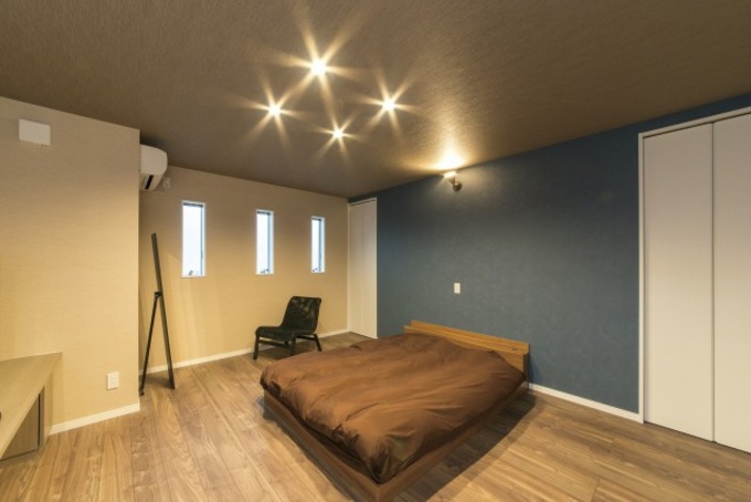 ベッドルームはブルーグレーの壁紙 間接照明などで優美さを感じさせる イエタテ